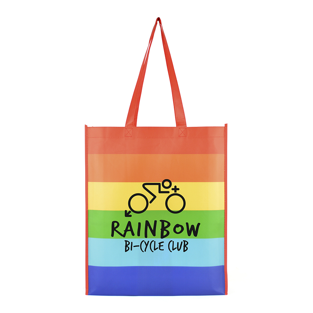 80gsm non woven PP shopper with horizontal rainbow print, gusset and long handles. Available in rainbow.